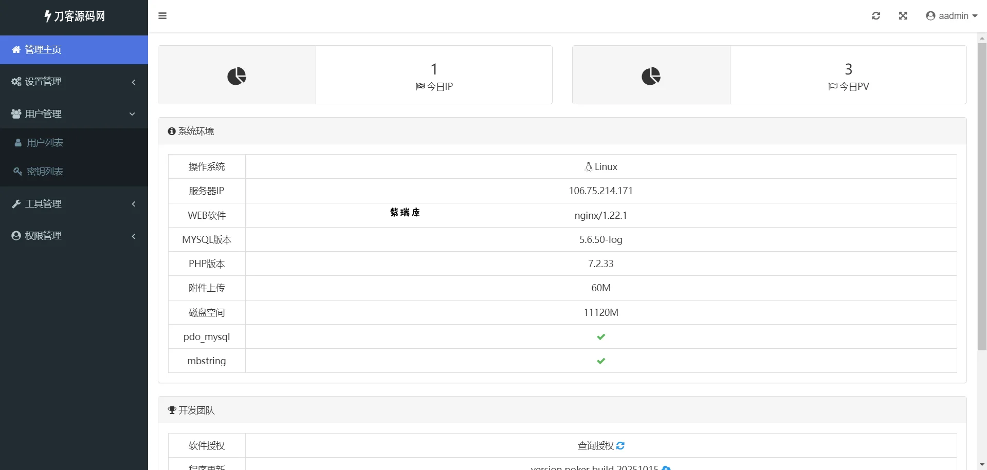 后台功能:ip访问统计、sql命令工具、升级模块、管理员模块、会员模块、卡密模块